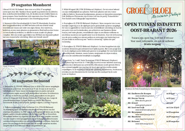 Laat je inspireren door de veelzijdigheid en schoonheid van tuinen in Oost-Brabant! Tijdens de Open Tuinen Estafette 2026 openen enthousiaste tuinliefhebbers op verschillende data hun groene paradijs voor publiek. Elke regio biedt zijn eigen sfeer, creativiteit en plantenrijkdom β van knusse stadstuinen tot parkachtige landgoederen en kleurrijke bloementuinen. Geniet van geurige borders, verrassende vijvers, kunstzinnige details en gastvrije ontmoetingen.
