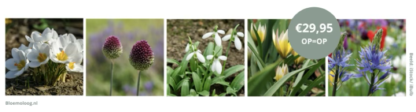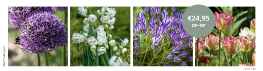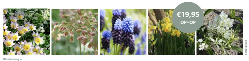 Biologisch bollenpakket ‘Lentekleur’ Van € 23,50 voor € 19,95 In het voorjaar snakken we naar kleur in de tuin. En dat niet alleen, we zien dan ook graag combinaties die we in de zomer wat heftig zouden vinden. Varieer erop los met dit pakket!