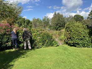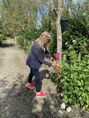 De andere helft mocht zich uitleven in de prachtige tuin van Sjaak. Gewapend met een snoeischaar struinden we langs borders en perken op zoek naar bloemen en groen om te gebruiken in ons eigen bloemstuk. Er was zóveel keus en alles was even mooi, dat het lastig kiezen was.